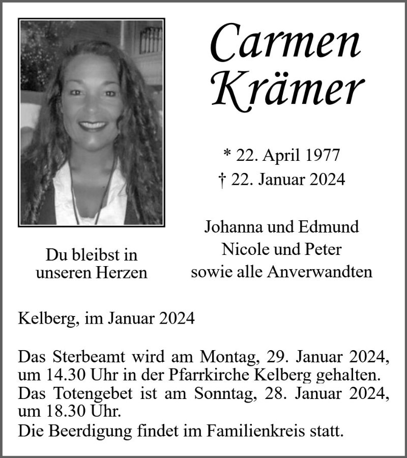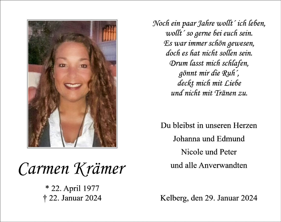 Ich möchte ihnen mein herzlichstes Beileid aussprechen. Ich werde Carmen immer als herzliche, lebenslustige Frau in Erinnerung behalten.